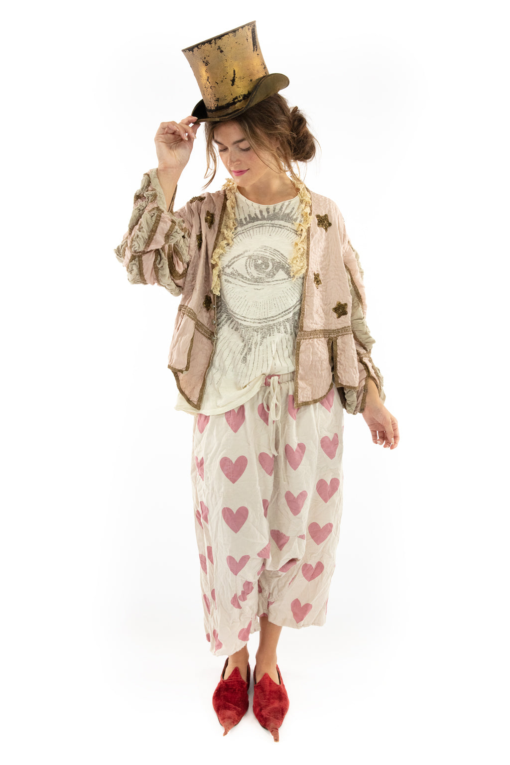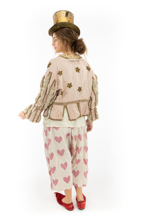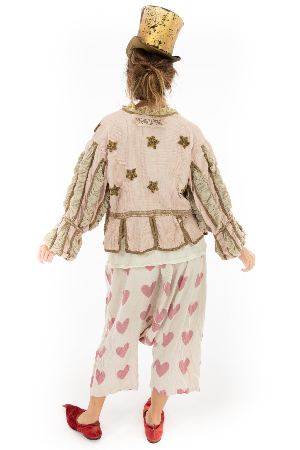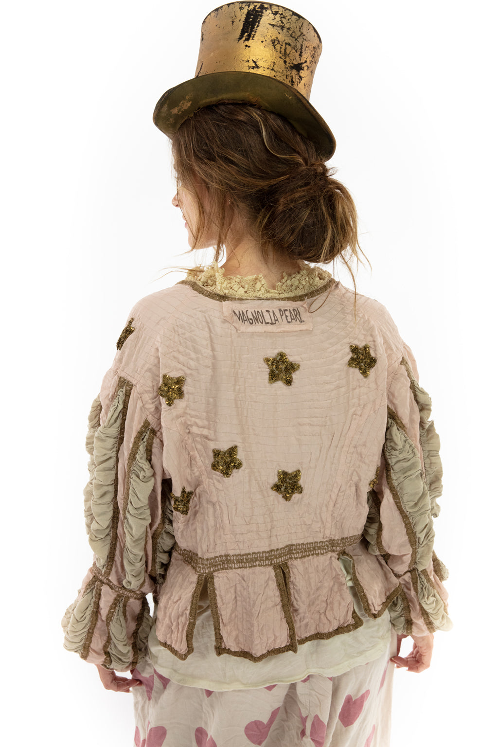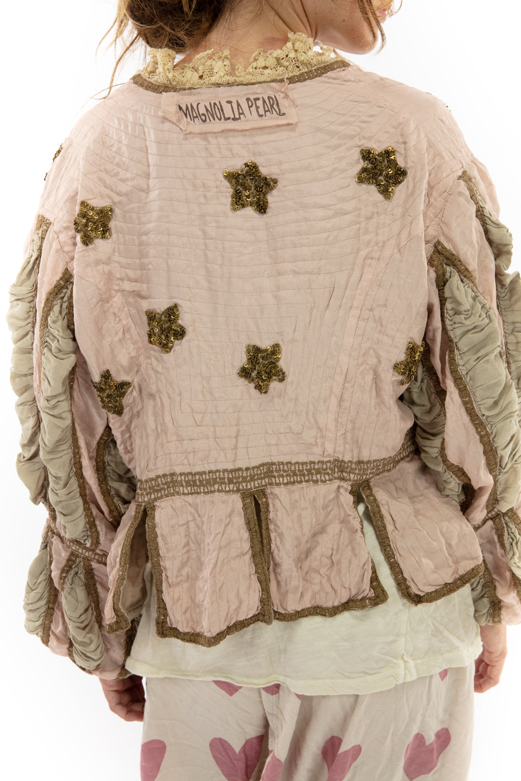 Капитонирано ръчно тъкано яке Monique от коприна с уникални характеристики на ръчно състаряване, ръчно пришити пайети, принтирана подплата, позлатен кант и плисирани ръкави