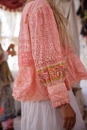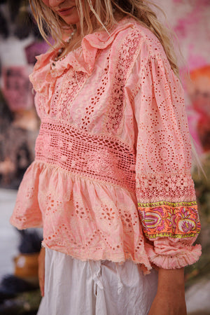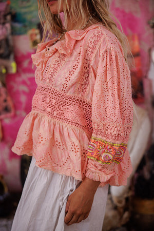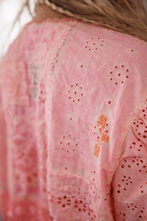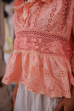 European Cotton Rose Pompadour Blouse with Crochet Bodice, Eyelet Ruffle Neck with Snaps, Lace Insets, Scallop Hem, Snaps at Sleeves, Hand Fade and Distress