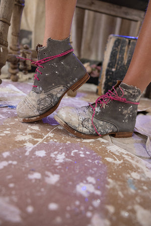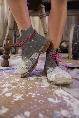 Leather Handmade Bojangle Boots with Paint Distress, Raw Edges, Patches, Leather Sole, String Laces