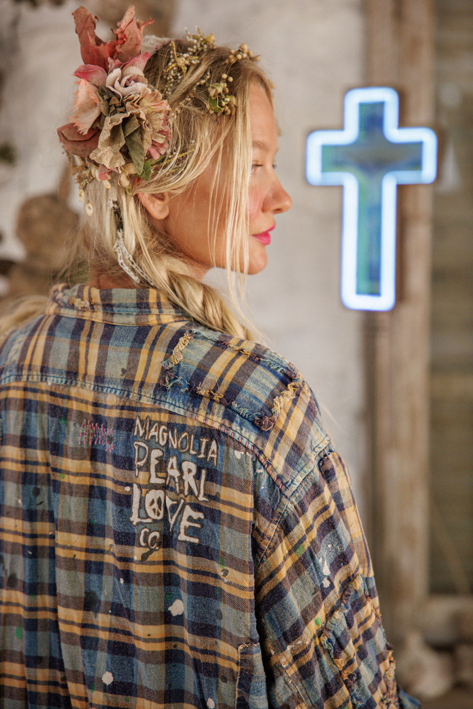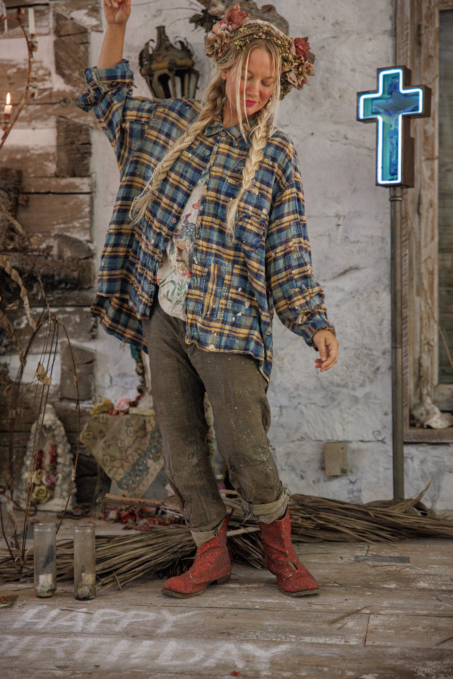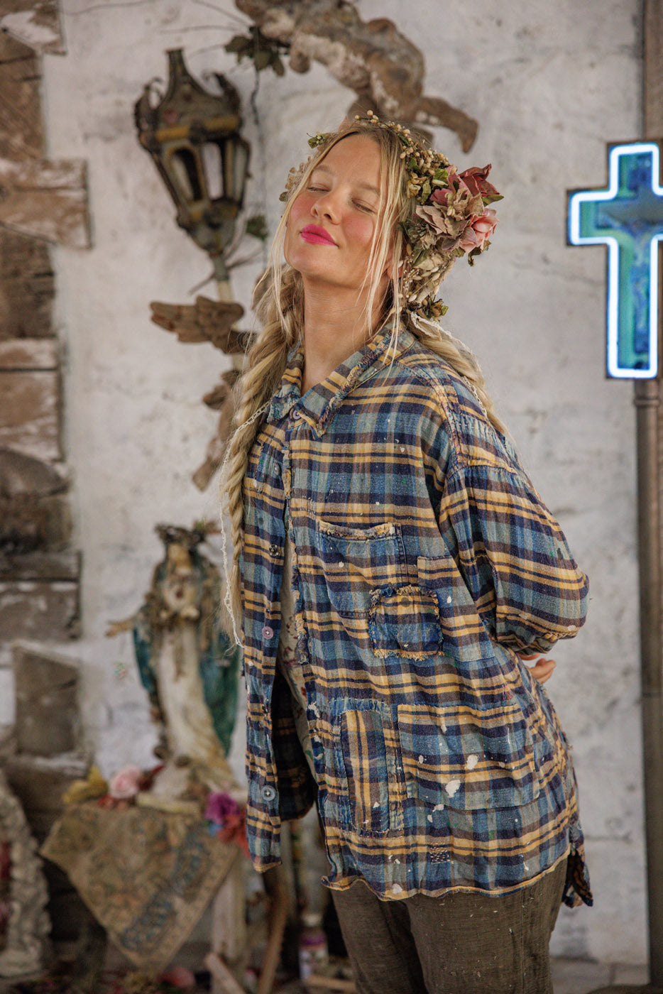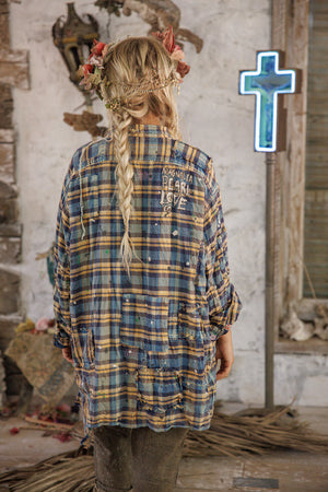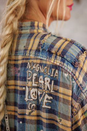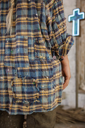 Garnfarvet bomuld Adison arbejdstøj med malerpletter, lapper, blandede knapper og trykknapper, håndslid og falmning
