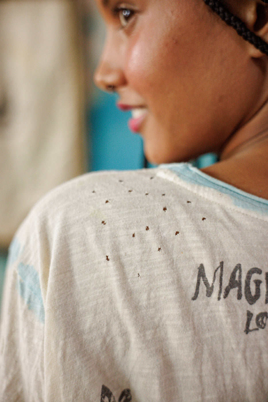 Hand-Distressing (Small Holes) at Neckline, Shoulders, Hems
