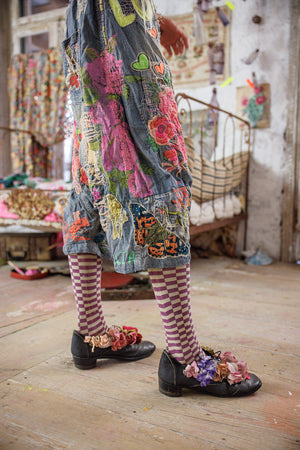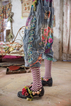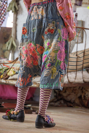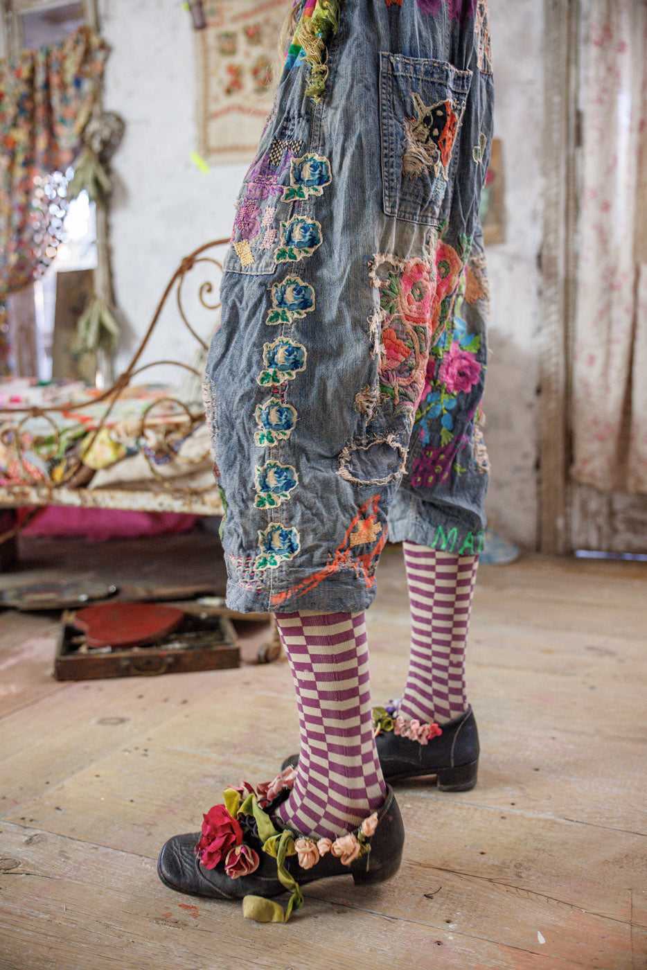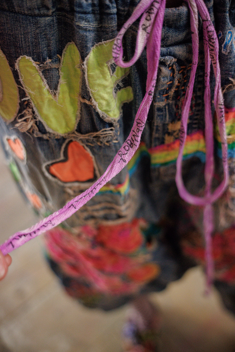 Denims Frankie en coton brodé avec des motifs artistiques, patchs, attaches à la taille, réparations manuelles lourdes, décoloration et usure