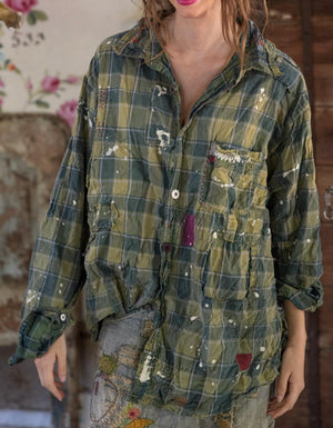 Chemise de travail Landes en coton teint à la laine avec éclaboussures de peinture, patchs, réparations à la main, décoloration et usure