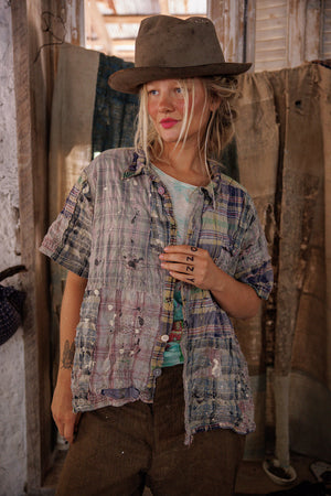 Chemise Perletta en patchwork de coton teint en fil avec éclaboussures de peinture, boutons mélangés, réparation à la main lourde, décoloration et usure