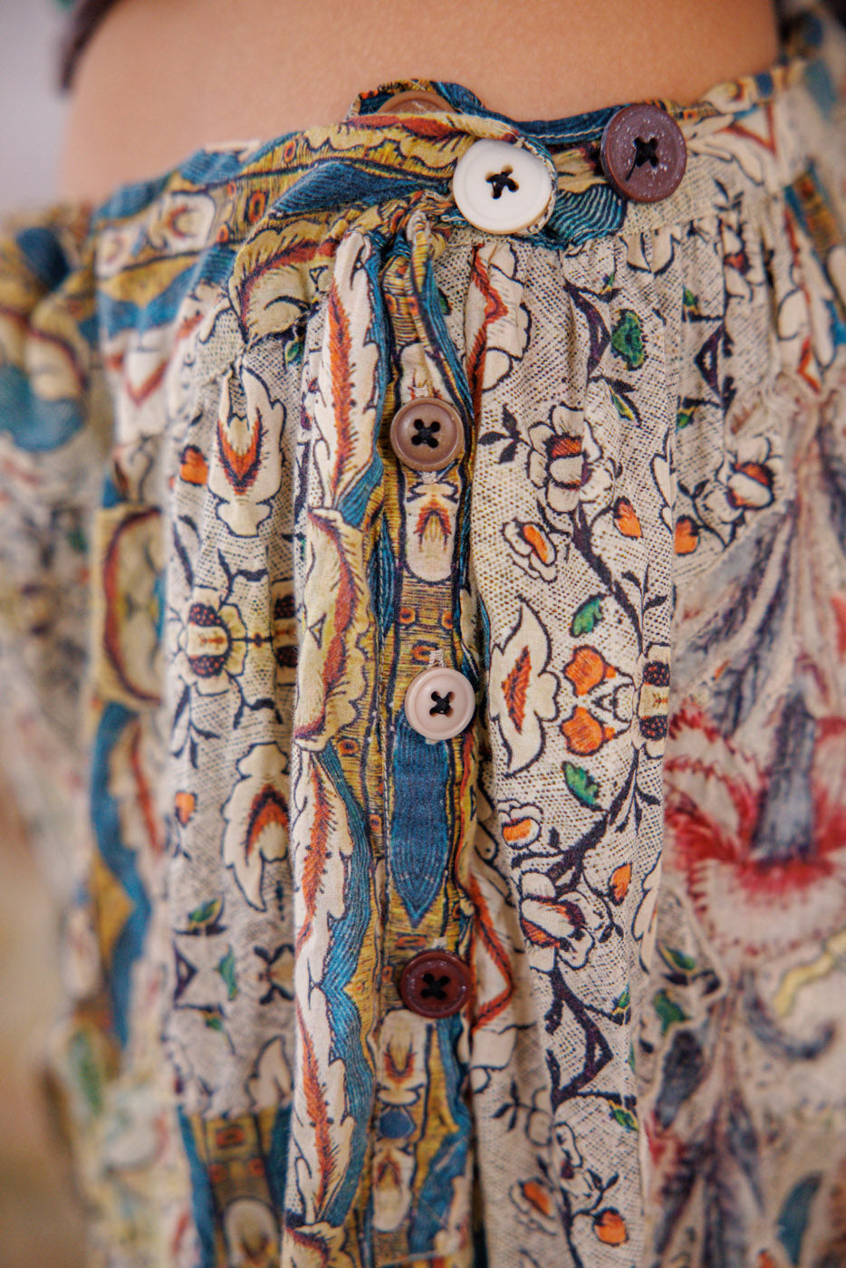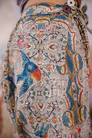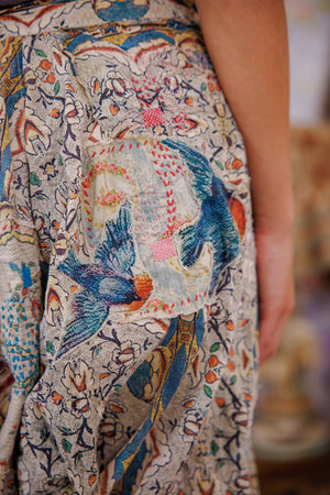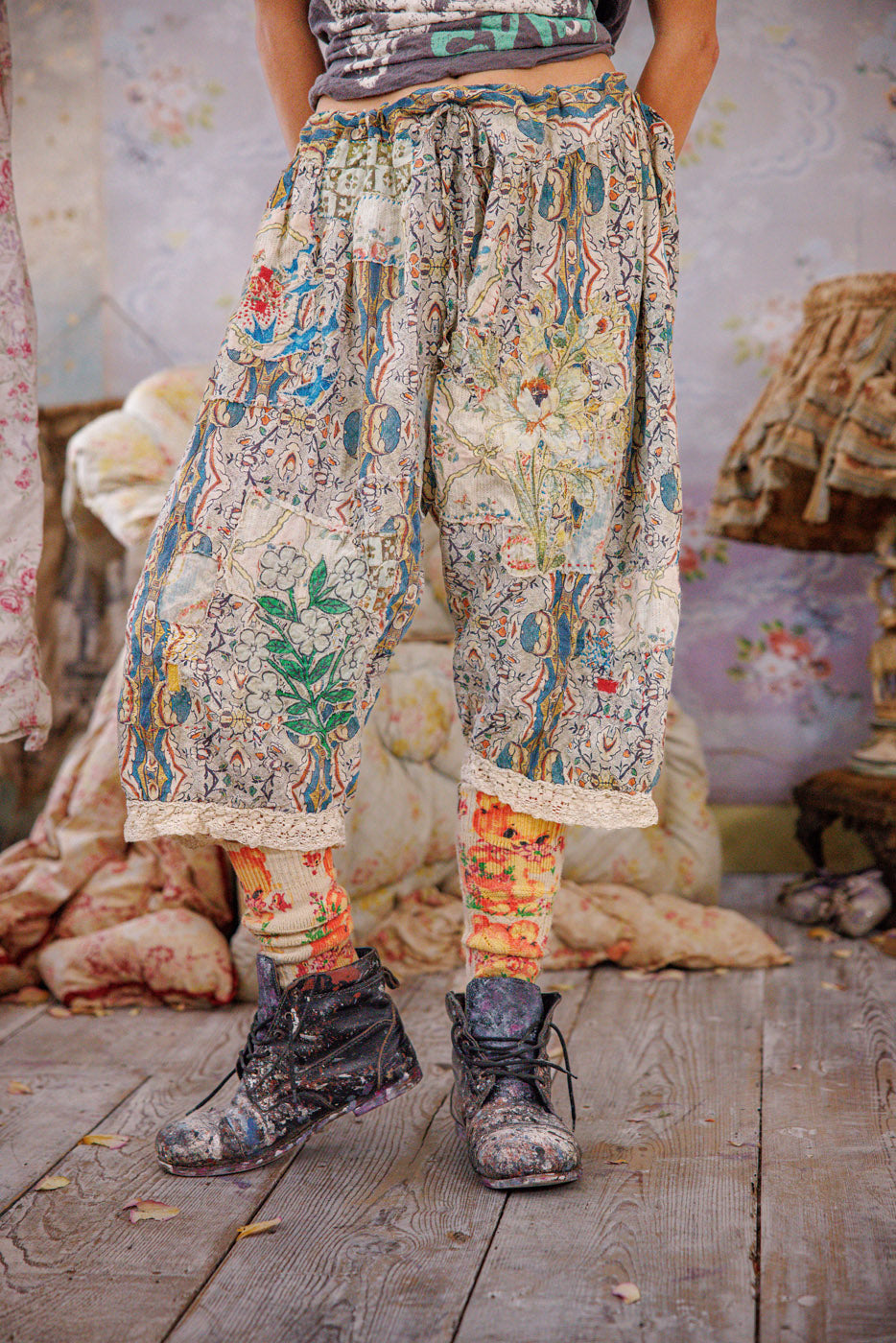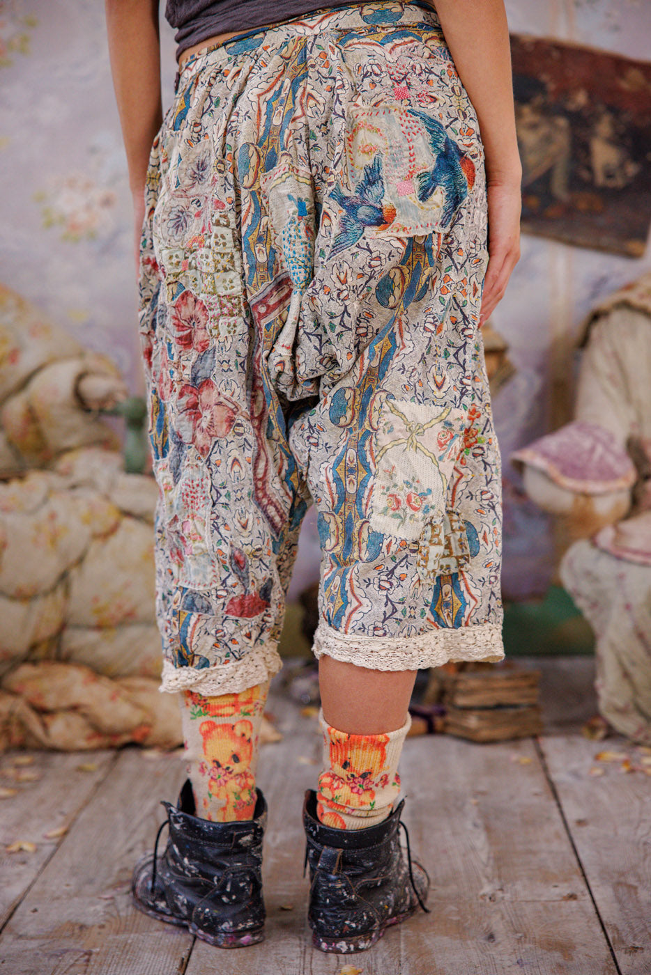Mutandine Kiki in cotone europeo con applicazioni, orlo in pizzo, toppe, bottoni laterali e vita con coulisse, riparazioni a mano e usura