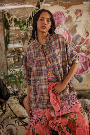Camicia da lavoro Adison in cotone tinto in filo con schizzi di vernice, toppe, bottoni misti e scatti, cuciture a mano, sbiaditure e usura