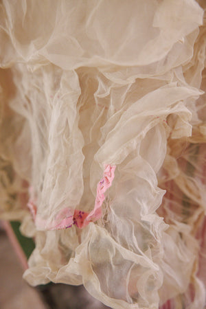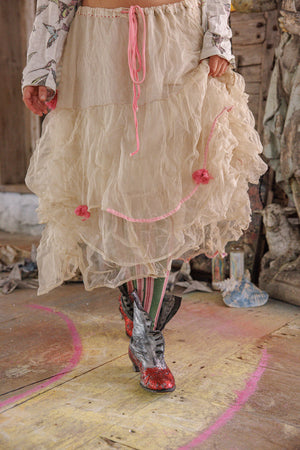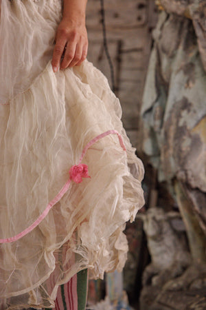 ヨーロッパのコットンオーガンジーのレイヤードルッカスカート、ドローストリングウエスト、リックラック、ハンドメイドの花、ハンドメンディング、フェーディングとディストレス付き