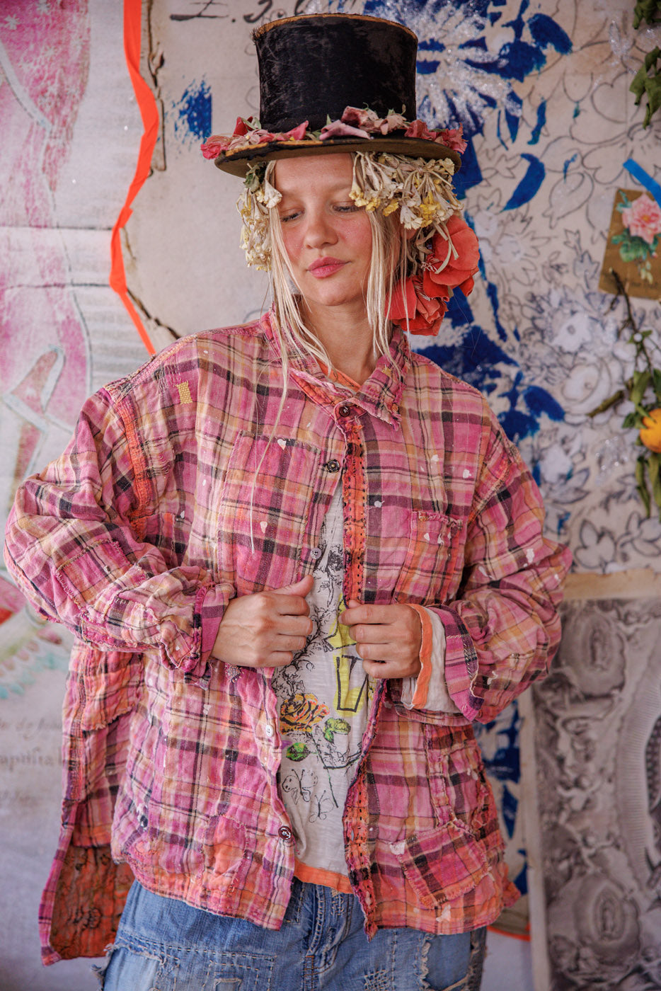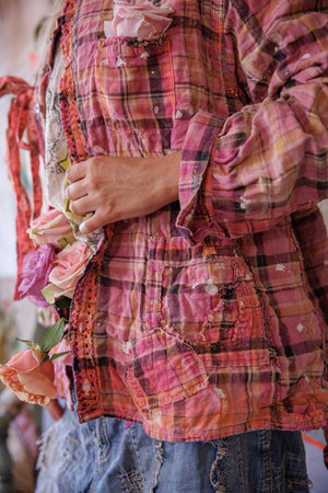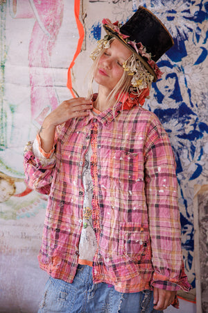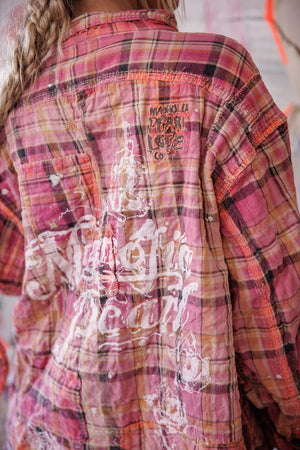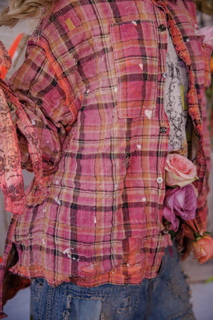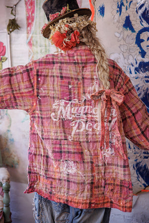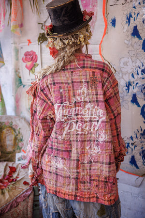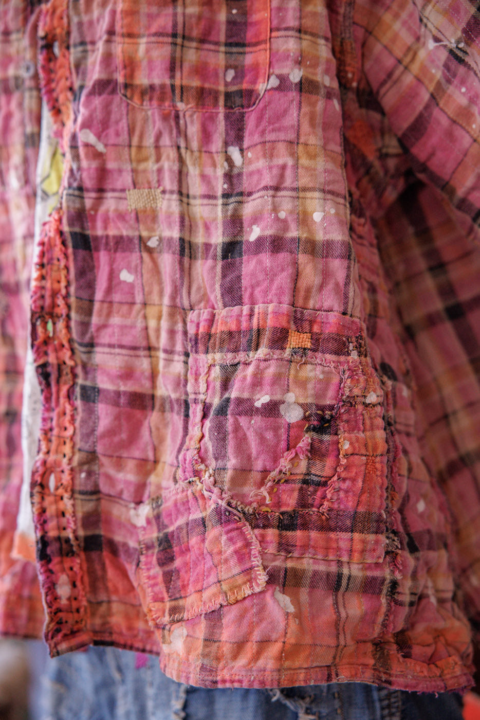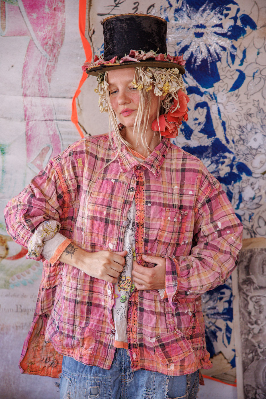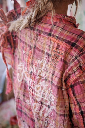 Siūlų dažyta medvilnė Magnolia Pearl Adison darbinė palaidinė su grafika, dažų taškeliais, rankomis dažytais siūlėmis, lopais, įvairiais mygtukais ir spaudėmis, rankiniu būdu išblukinta ir pažeista
