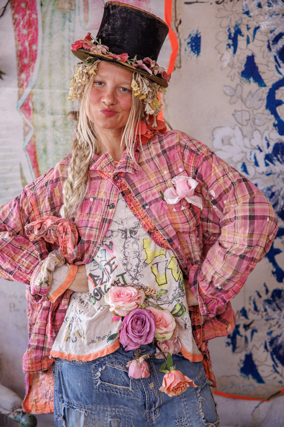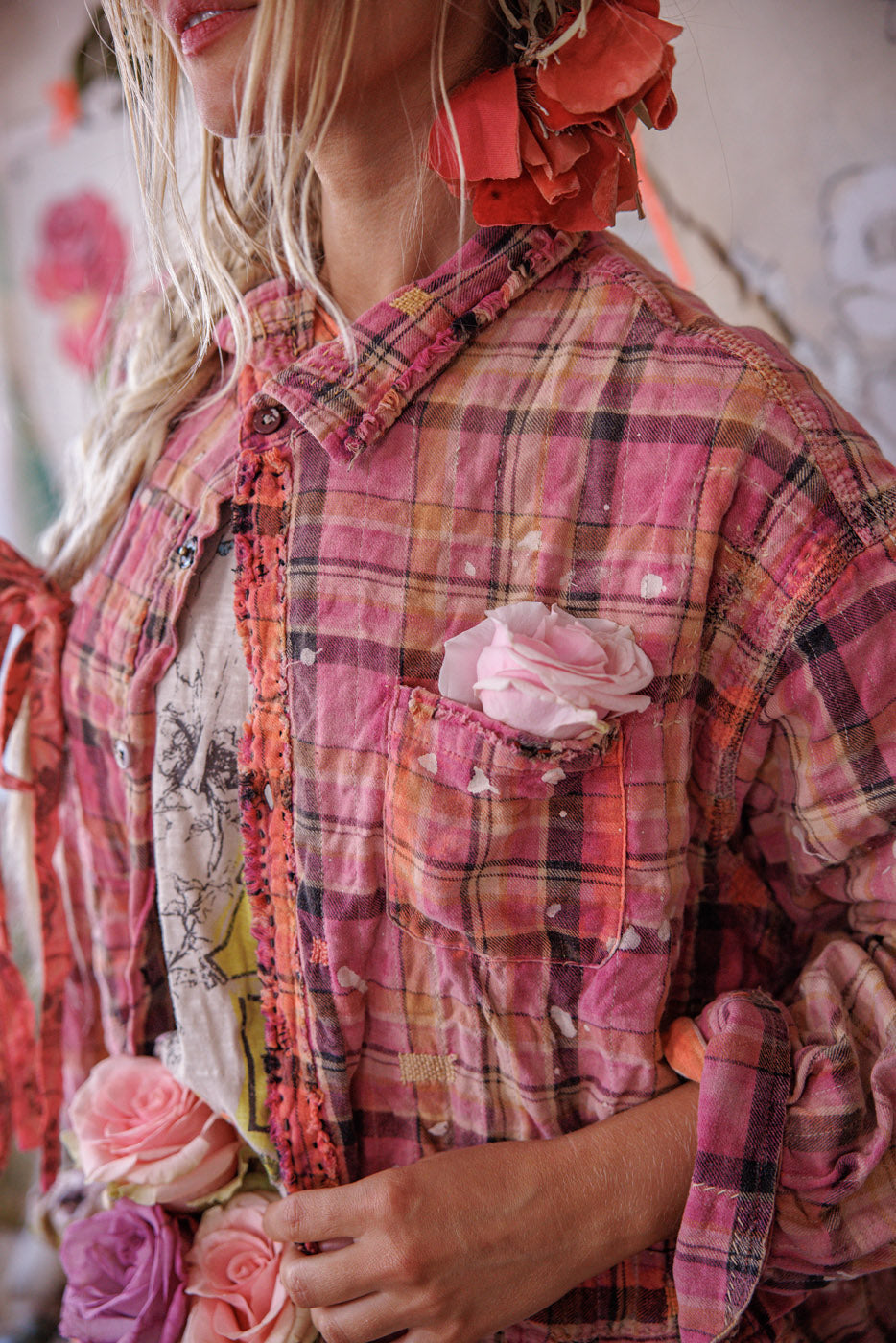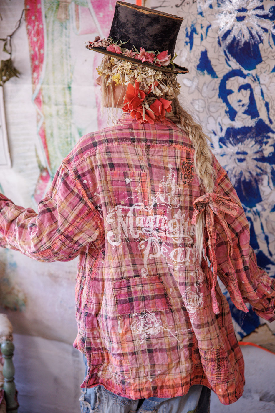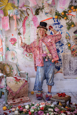 Siūlų dažyta medvilnė Magnolia Pearl Adison darbinė palaidinė su grafika, dažų taškeliais, rankomis dažytais siūlėmis, lopais, įvairiais mygtukais ir spaudėmis, rankiniu būdu išblukinta ir pažeista